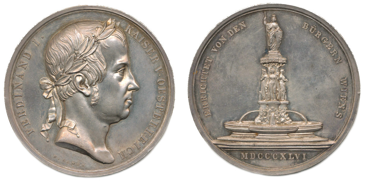 K.Lange - Medaile k postavení kašny Schwathaler - Brunnen ve Vídni Poprsí císaře zprava, opis / kašna, opis, letopočet v úseči 1846 Sign., Ag 50 mm, 56.81 g, Mo.2624, Ho.3651, LG.XII/364