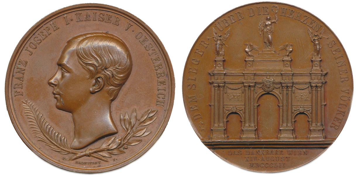 Radnitzky - Medaile na návrat císaře do Vídně, 1852 Hlava zleva, ratolesti, opis / triumfální brána, nápis a opis, Sign., Bronz 50 mm