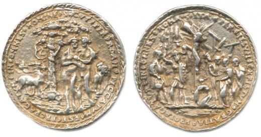 Scéna prvního hříchu - Adam a Eva v Ráji, opis / scéna ukřižování opis, Ka.422 tab.LIV-5, Enz.207, Don.4372, Ag 35 mm, 13,46 g_R!