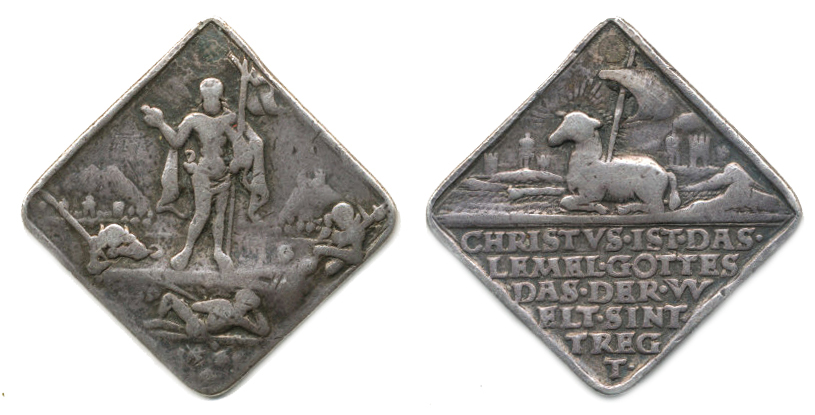 Beránek boží, pod ním 5řádk.nápis / zmrtvýchstání Krista, 1546, Sign.(Christoph Füssl), Ag klipa 24x24 mm, 7.42 g_R!