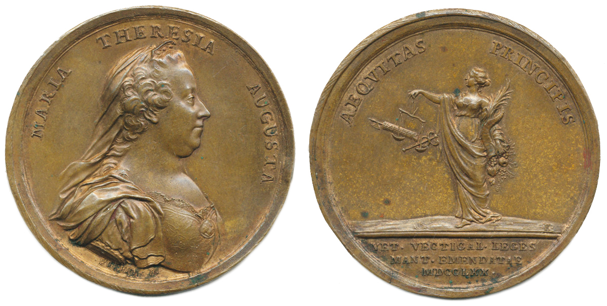 Krafft - medaile na zlepšení celních zákonů v Mantově 1770 Poprsí zprava, opis / stojící Aequitas zleva, 3řádk.nápis v úseči, opis, Sign., Ag 49 mm, LG.XIV/256 (Ag), Mo.2019 (Ag), SD.230_R!