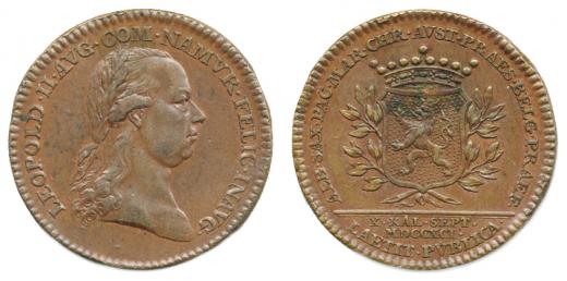 Větší peníz na holdování v Namuru, 1791#Br Portrét Leopolda II. zprava, nápis / korunovaný znak se lvem zleva, 3řádk.nápis v úseči, opis, Nesign., Bronz 27 mm, Nov.XVI/M-1c Mo.2234, Ho.3261_R!