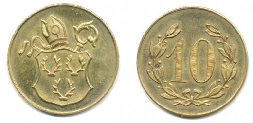 Známka v hodnotě "10", b.l., znak kláštěra / hodnota "1" v ozdobném kartuši, Mosaz 23 mm, Pol.223_R! tém.