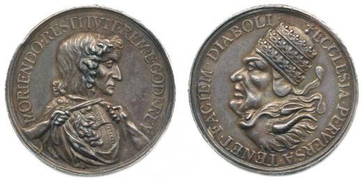 Sir Edmundbury Godfrey - zavražděný v r.1678 Poprsí zprava se smyčkou na krku, opis / portrét papeže s tiárou, obráceně portrét papeže vyrůstající z tiáry, opis, plastický nápis na hraně, Sign.G.Bower, Ag 38 mm_dr.hr. RR! tém.