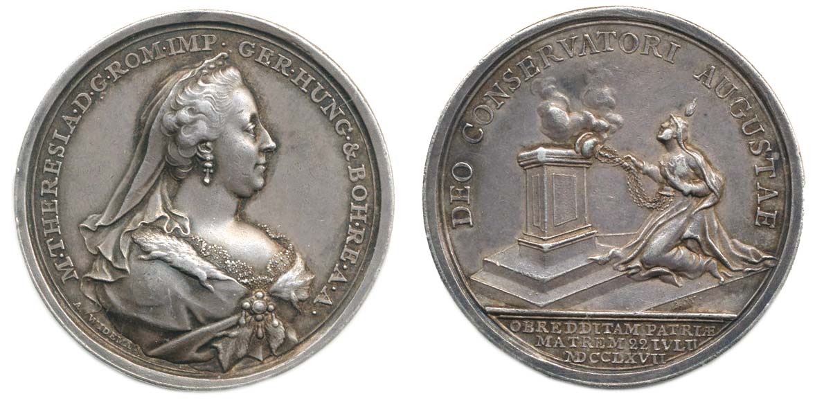 Wiedeman - na uzdravení od něštovic 1767 Poprsí zprava, opis / klečící královna před oltářem, opis a nápis v úseči, Sign., Ag 47 mm, 34.75 g, Mo.1976, Ho.2947, LG.XIV/222_tém.