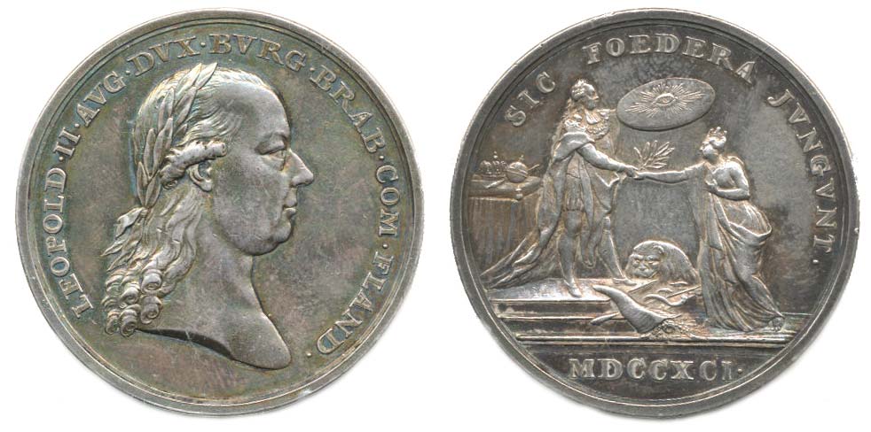 Medaile na holdování flanderských stavů, 1791#Ag Poprsí zprava, opis / císař přijímá hold Belgie, korunov.klenoty, opis, Nesign., Ag 39 mm, 26.16 g, Nov.XVI/K-2b, Mo.2229, Ho.3259_tém.