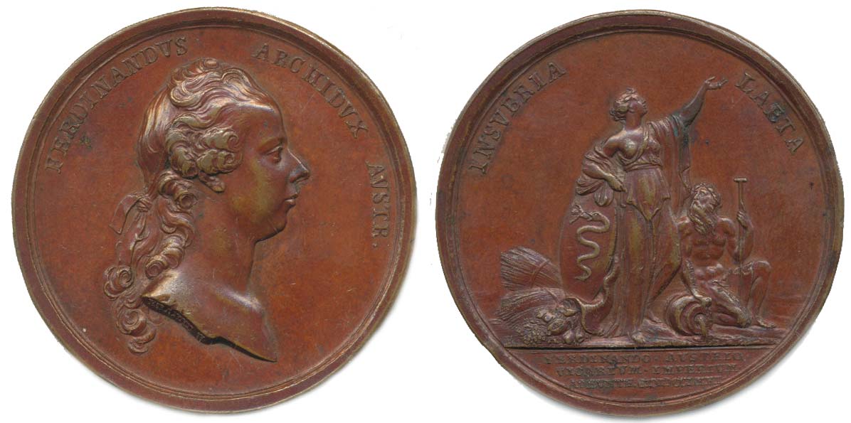 Kraft - na jmenování arcivévody guvernérem v Lombardii, 1771#Br Poprtrét zprava, opis / bohyně města se znakem, 3řádk.nápis, opis Sign., Bronz 49 mm, LG.XIV/268 (Ag), We.8039, SD.241 (Ag)_R! tém.