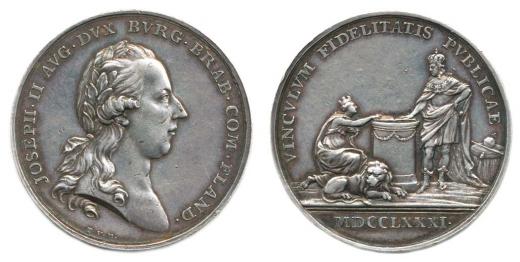 T.van Berckel - medaile na holdování v Belgii v r.1781 Portrét Josefa II. zprava, opis / klečící Belgie se lvem vzdává hold císaři, nápis v úseči, opis, Sign., Ag 40 mm, 26.32 g, Nov.XV/H-3b Mo.2139, Ho.3155, LG.XIV/932_R! tém.