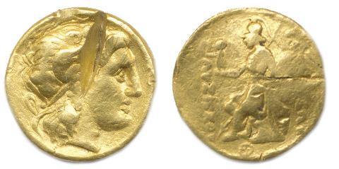 AV Stater, hlava Alexandra Velikého zprava / sedící Athena se štítem na trůně, vlevo drží Nike, vertik.nápisy, pod trůnem kolo š křížkem SGI.6813, jako Müll.337_dobový sek v aversu (k ověření pravosti) R!