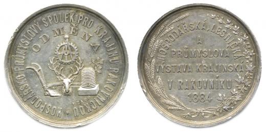 Zapp - hospodářská, lesnická a průmysl. výstava, 1884#Ag Výstavní předměty, opis / 6-řádkový nápis ve věnci, Sign., Ag 35 mm, 16,05 g_dr.hry
