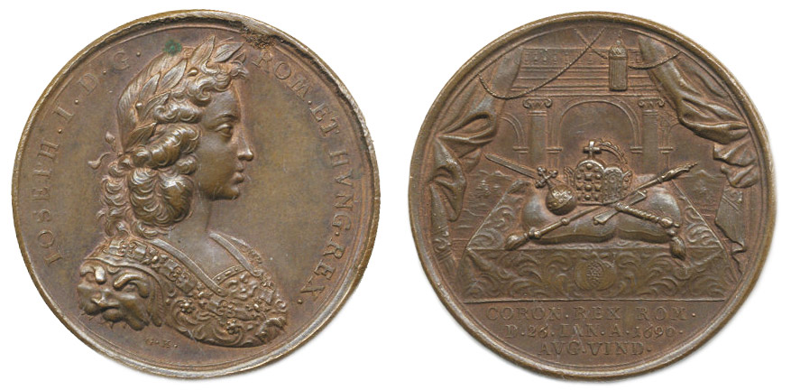 Hautsch - medaile na římskou korunovaci, 26.I.1690#Br Poprsí zprava, opis / korunovační insignie na podušce, opis Sign., Bronz 35 mm, 15,18 g, Mo.1215 (Ag), Nov.X/B-22b_R! tém.