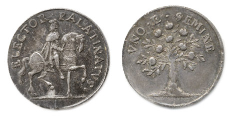 Medaile na římskou korunovaci v Augsburgu, b.l. (1690) Falcký kurfiřt na koni zprava, opis / strom s granátovými jablky Nesign., Ag 17 mm, 2.33 g Nov.X/L-79a, Mo._R!