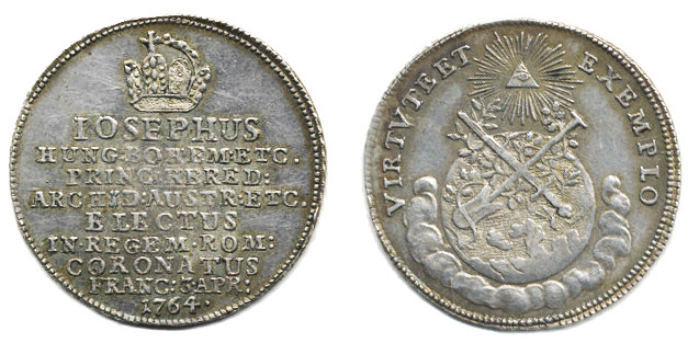 Větší peníz na korunovaci ve Frankfurtu, 3.IV.1764#Ag Pluh a meč na zeměkouli, boží oko, opis / cís.koruna a 9řádkový nápis, Ag 25 mm, 4.021 g, Nov.XV/C-13b, Neum.36332, Ho.3128_tém.