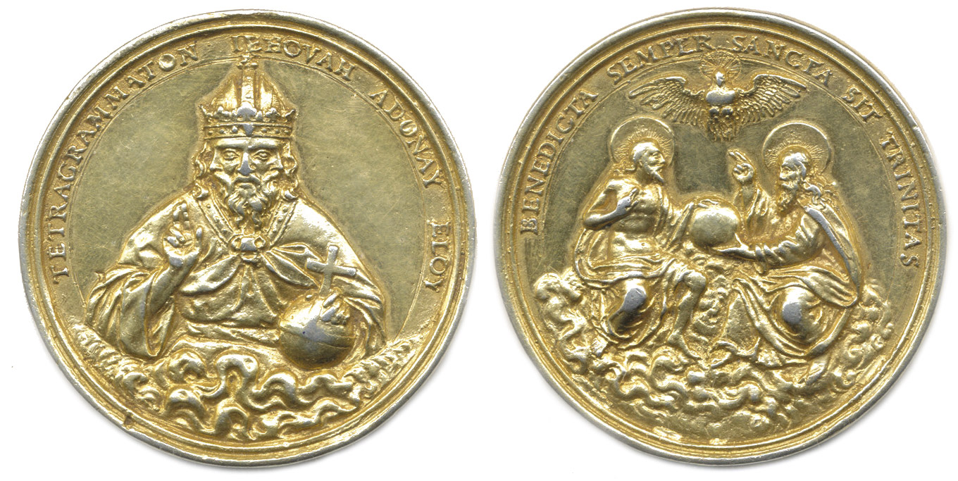 Bůh Otec se třemi obličeji, opis / Svatá trojice, opis, b.l. Pozlac.Ag 55 mm, 40,28 g, Ho.6397, Aurea.45/399_R!