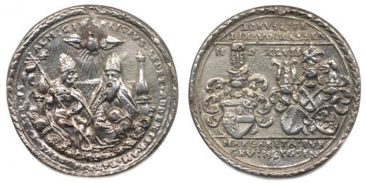 Svatá rodina, opis / Bohuslav Felix von Hassenstein - znak Hassensteinů, opis 1547, Katz.351, tab.LIII/3, Lité Ag 41 mm, 21,95 g _tmavá skvrna R!