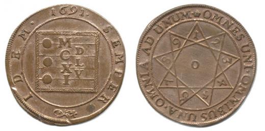 Početní fenik 1691, ve středu abakus s římskými číslicemi, latinský opis / 9cípá hvězda s číslicemi 1-9, uprostřed 0, latinský opis OMNES UNI OMNIBUS OMNIA OMNIA AD UNUM, Cu 25,5 mm Appel.4032, tab.8/15_RRR!