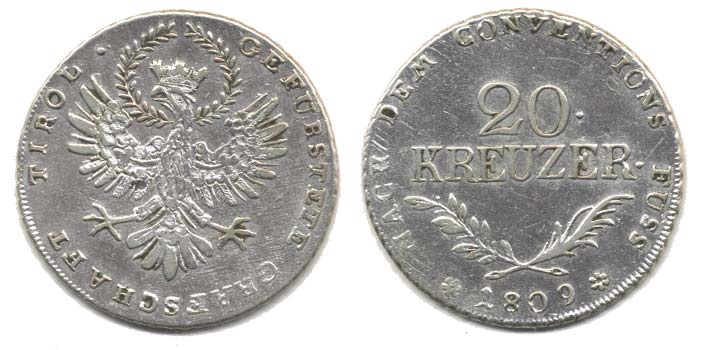 20 Krejcar 1809, P.61b (plastický jetelový lístek v křídlech orlice) _tém.