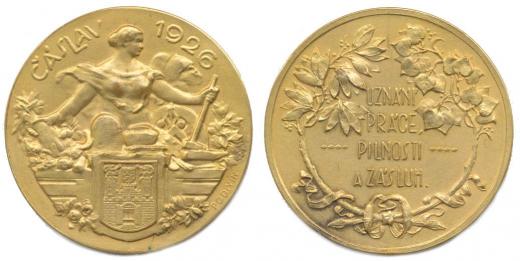 Podivín - uznání práce, pilnosti a zásluh 1926 Stojící ženská alegorická postava s atributy živností a zemědělství, znak města, opis / 4řádk.nápis v ozdobném věnci, Sign., Pozl.bronz 42 mm