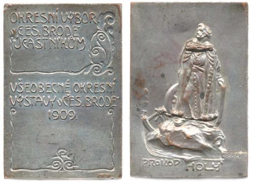 Pichl a Hervert - všeobecná okresní výstava, 1909 Socha Prokopa Holého, nápis / šestiřádkový nápis v ornamentu, Sign., Postř.bronz.plaketa 40x60 mm, Haus.3870 (Br.)