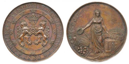 Kettner - jubilejní výstava, 1888 Stojící Ceres s výstavními předměty, nápis na stuze / znak města, opis, Sign., Cu 47 mm, Haus.3687 (Ag)
