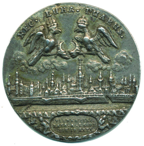 Jan III.Sobieski - medaile na osvobození Vídně od Turků 12.9.1683 Panorama města převýšené rakouským orlem a polskou orlicí proti sobě, 3řádk.nápis ve spodním oválu, latinský opis, Nesign., Litý postř.bronz 46 mm_R!