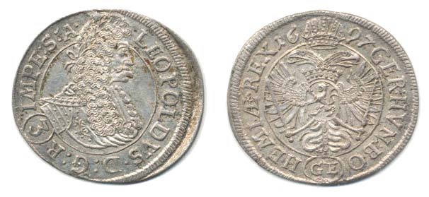 3 Krejcar 1697, Praha-Egerer, Nech.208, MKČ.1425, Ja.11a/11c ale v opisu .IMPE._R! tém.