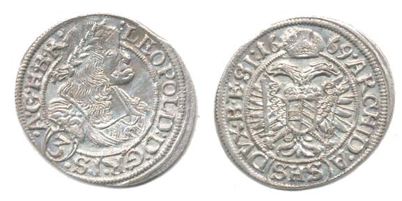 3 Krejcar 1669, Vratislav-Hammerschmidt, Nech.739, Her.1538 koruna bez stuh
