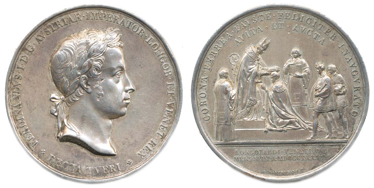 Manfredini - medaile na korunovaci v Miláně 1838#Postř Portrét zprava, opis / korunovační scéna, nápis, opis Sign., Postř.bronz 52 mm, jako Mo.2578, jako Nov.XVIII/G-1c (Bronz) Haus.34