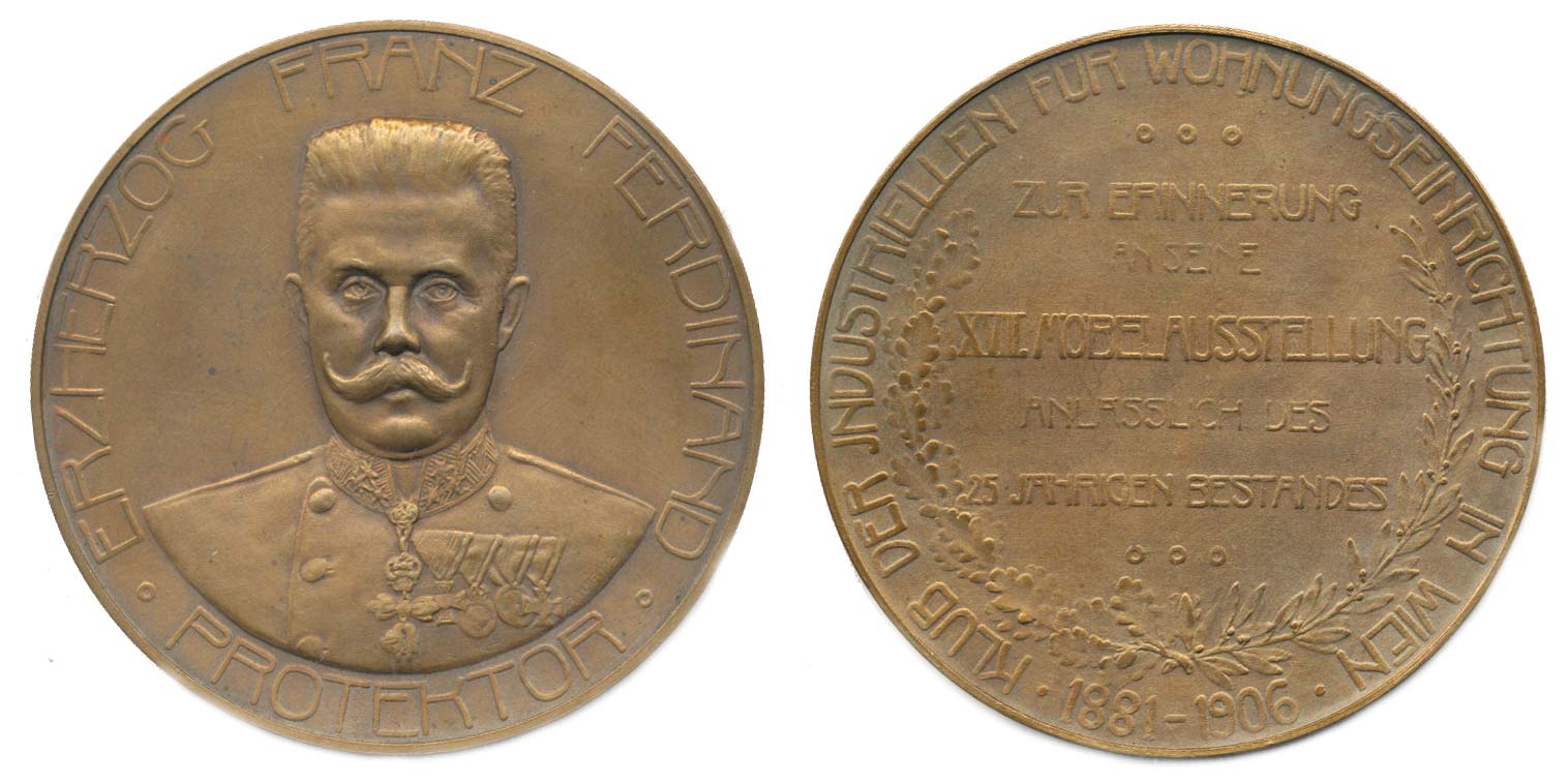 A.Hartig, W.Pittner - medaile na XVIII. výstavu nábytku ve Vídni 1906 Poprsí arcivévody čelně, opis / 5řádk.nápis ve věnci, opis Sign., Bronz 60 mm, Haus.3081_R!