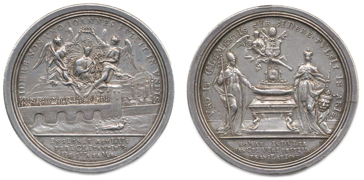 Přenesení ostatků Sv.Jana Nepomuckého, 1721#Ag Světec korunovaný anděly nad Karlovým mostem, 3řádk.nápis, opis / náhrobek, 3řádk.nápis, opis, Ag 48 mm, 43,71 g, Don.4648_R! tém.