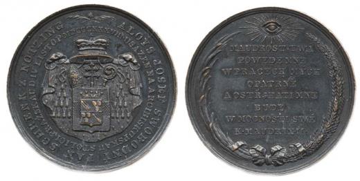Lerchenau - intronizační medaile 4.XI.1838#Br Korunovaný znak ve dvojitém českém opisu / 8řádkový český nápis, Sign I.L., Bronz 35 mm, Don.4671, Přib.504, Gr.15 _tmavá patina