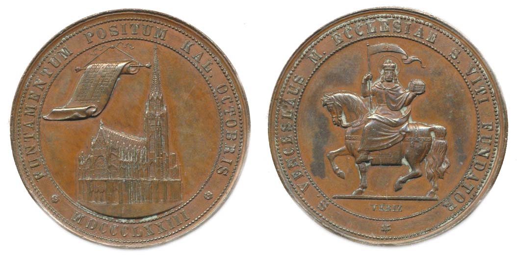 Chrám svatého Víta, plán dostavby, opis / svatý Václav#Br jedoucí na koni zleva, opis, 1873, Sign.V.Kříž leva, Bronz 41 mm, Př.655b, Gr.99, Do.4946