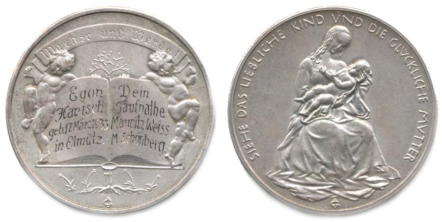 Nesign. - matka s dítětem, něm.opis / dva andílci drží otevřenou knihu s vyrytým věnováním Egon Haisch geb.17.März 1935 in Olmütz - Dein Taufpathe Mautirz Weiss M.Schönberg, Ag 36 mm punc.835, Ag 24,77 g, na hr. 835 PR.MÜNZE BERLIN