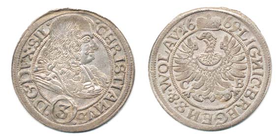 3 Krejcar 1669 CB, SJ.444/149, ale zcela jiné opisy, Kop.5461var. vlnité vlasy, opis končí:SIL, .WOLAV.