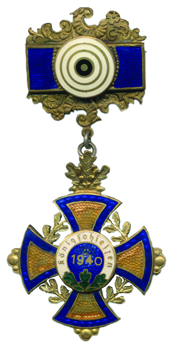 Šumperk ( Mähr.Schönberg) - střelecký smaltovaný kříž 1940 V medailonu "Königschiessen 1940", Smaltov.bronz 45x54 mm na ozdobném závěsu modrobílý smaltovaný štítek s terčem Stříbř.bronz 35x37 mm_připínací