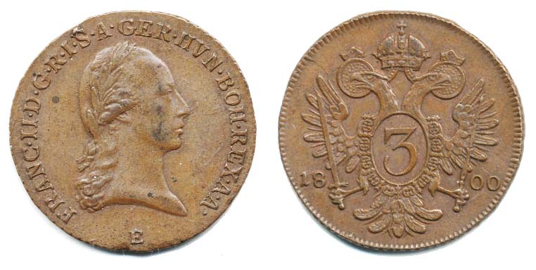 Cu 3 Krejcar 1800 E, minc.Karlovský Bělehrad_dr.hr.raž.