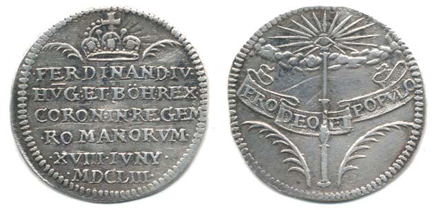 Nesign. - střední žeton ke korunovaci na římského krále v Regensburgu, 18.VI.1653, pod korunou 6řádk.nápis / Boží oko, žezlo, palmové ratolesti a nápis na stuze, Ag 24 mm, 2,23 g Nov.VIII/D-8b, LG.II/474, Mo.845_R!