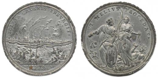 C.G.Laufer, Norimberk - na dobytí města Tournay (v prov.Henegau) v r.1709, pohled na ostřelování města, 2řádk.nápis v úseči, opis / Pax se znakem města, Fúrie s řetězem, opis, plastický nápis na hraně, Sn 44 mm, Mo.1314 (Bronz), Julius.713, Ho.2456_RR!