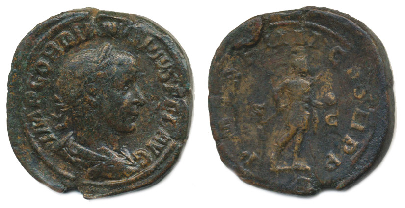 AE Sestercius, Rv:"P.M.TR.P.IIII.COS.II.P.P.", stojící Gordián s oštěpem a globem, S.2399, RIC.306, C.254