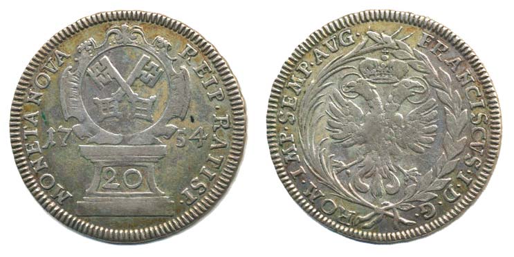 20 Krejcar 1754 s titulem Frant.Lotrinského, Sch.94, KM.368, Cr.21