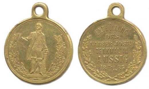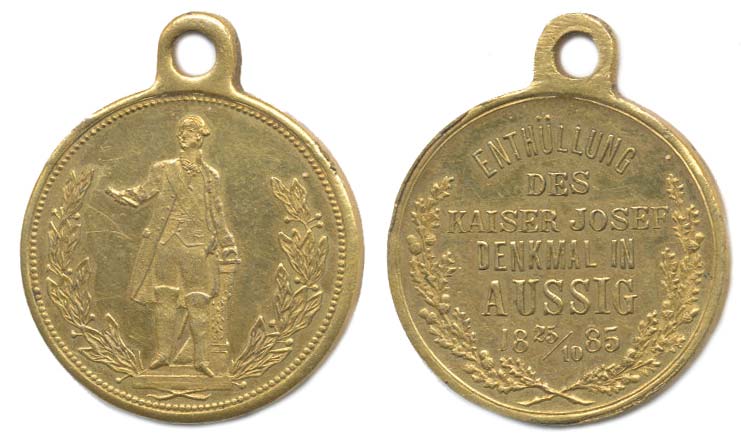 Ústí n.L. (Aussig) - na odhalení pomníku 25.10.1885 Stojící císař čelně ve věnci / 6řádk.nápis ve věnci Nesign., Pozlac.bronz 29 mm, 11,29 g_orig.raž.ouško