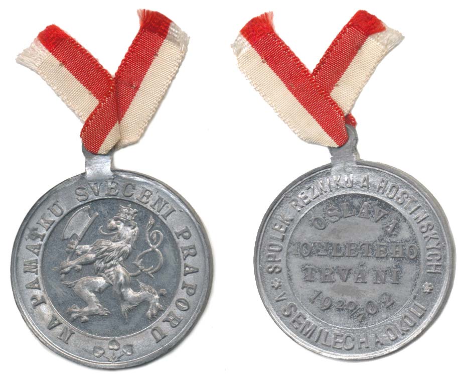 Semily - na památku svěcení praporu - spolek řezníků a hostinských oslava 10ti letého trvání 20.7.1902, lev se sekyrou zleva, opis / 4řádk.nápis, opis, Sn 33 mm_orig.ouško s bikolorou tém.