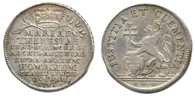 Větší peníz na holdování hornorakouských stavů v Linci, 25.6.1743 Pod korunou snítky a 9řádk.nápis / stojící lev, znak a kříž, opis Ag 25 mm, 4.05 g, Nov.XIII/H-1b, Mo.1729, LG.XIV/48