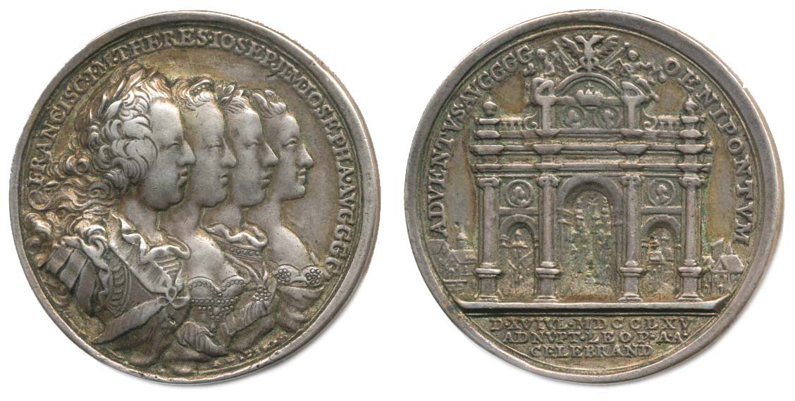 A.Wideman - medaile na návštěvu Innsbrucku při příležitosti svatby Leopolda II. a Marie Lodovici, čtyřportrét zprava, opis / městská brána, 3řádk.nápis v úseči, opis 1765, Sign., 46 mm, 36,64 g, LG.XIV/200, Mo.1942, SD.178_R!