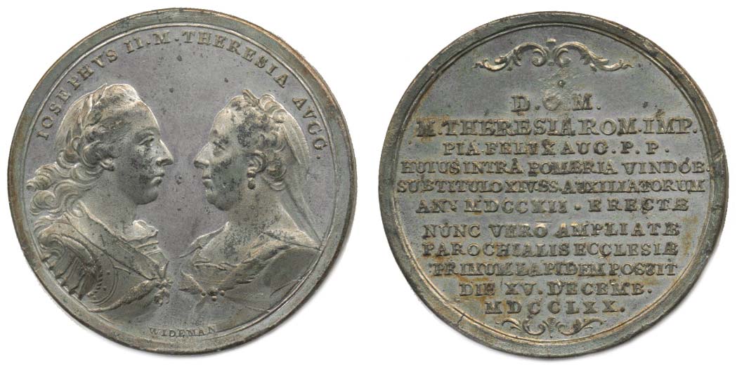 Wideman - medaile na rozšíření kostela 14 pomocných v nouzi ve Vídni 15.12.1770, poprsí Marie Teresie a Josefa II. proti sobě, opis / 11řádk.nápis, Sign., Sn 42 mm, 20,43 g, Mo.2018 (Ag), LG.XIV/255 (Br) SD.229_R! tém.