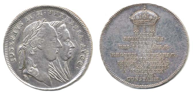 Větší jeton na návštěvu v Budapešti 25.6.1780 v souvislosti se školskou reformou v Uhrách, dvojportrét zprava, opis / 12řádk. nápis, Nesign., Ag 26 mm, 3.96 g, Mo.2096, LG.XIV/301_dr.škr. v av.