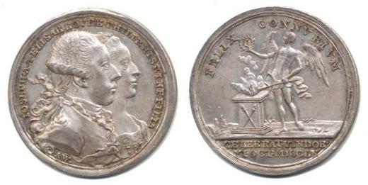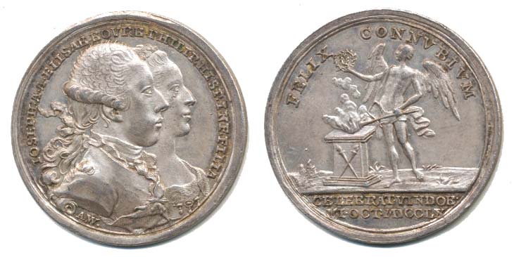 A.Widemann - na sňatek Josefa II. s Alžbětou Parmskou, 1760 Dvojportrét zprava, opis / Anděl zapaluje oltář, 2řádk.nápis v úseči, opis, Sign.A.W., Ag 28 mm, 6.56 g, Mo.1893_tém.