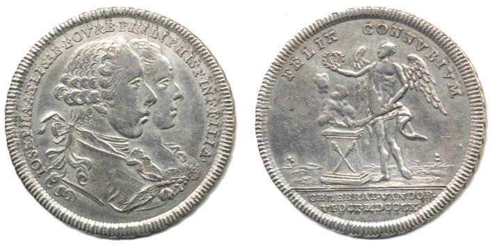 A.Widemann - na sňatek Josefa II. s Alžbětou Parmskou, 1760 Dvojportrét zprava, opis / Anděl zapaluje oltář, 2řádk.nápis v úseči, opis, Nesign., Ag 28 mm, 6.48 g, Mo.1894