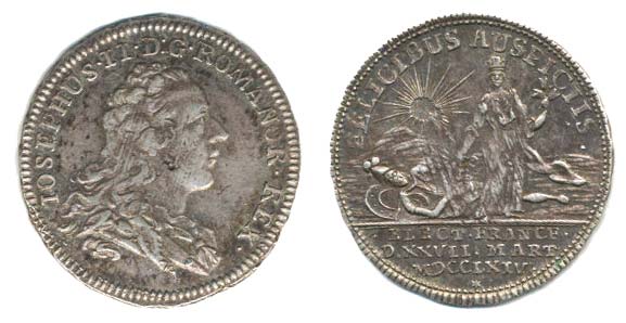 Menší peníz na volbu ve Frankfurtu, 27.3.1764 Portrét císaře zprava, opis / patronka města nad spoutaným válečníkem, opis, nápis v úseči, Ag 22 mm, 2.51 g, JF.2187a, 842e, Nov.XV/B-7b