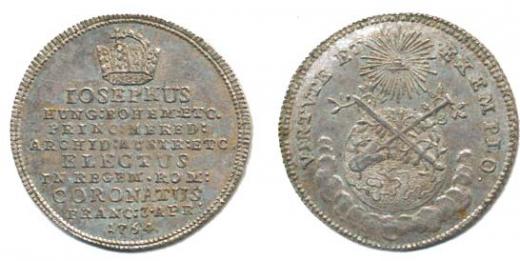 Menší peníz na korunovaci ve Frankfurtu, 3.IV.1764 Pluh a meč na zeměkouli, boží oko, opis / cís.koruna a 9řádkový nápis, Ag 21 mm, 1.96 g, Mo.1922, Ho.3128, Nov.XV/C-14b